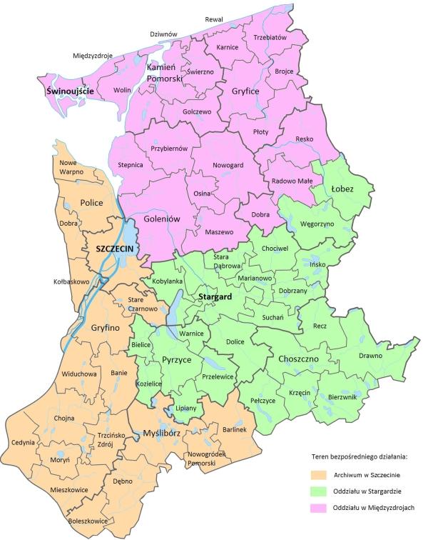 Teren działania Archiwum Państwowego w Szczecinie pokrywa się w większości z obszarem dawnego województwa szczecińskiego (z lat 1975-1998). Część powiatów podlega pod oddziały w Międzyzdrojach i Stargardzie, które przechowują wybrane materiały wytworzone po 1945 roku. Pod AP w Szczecinie bezpośrednio podlega Gmina Miasto Szczecin oraz powiaty: gryfiński, myśliborski i policki.
