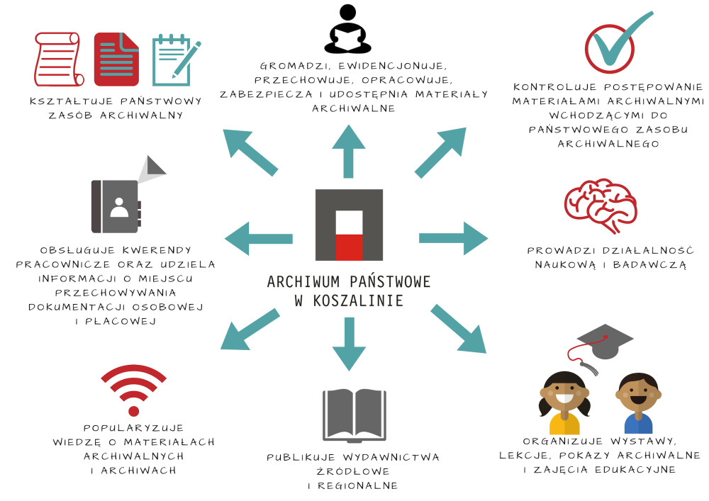 Archiwum Państwowe w Koszalinie jest urzędem administracji rządowej. Jego zadaniem jest gromadzenie, opracowywanie, przechowywanie i udostępnianie najważniejszych dokumentów powstałych w urzędach administracji publicznej i niektórych innych instytucjach działających na terenie środkowego Pomorza. Archiwum jest także placówką naukową, która zajmuje się badaniem zgromadzonych dokumentów oraz prowadzeniem działalności informacyjnej, popularyzatorskiej i wydawniczej.